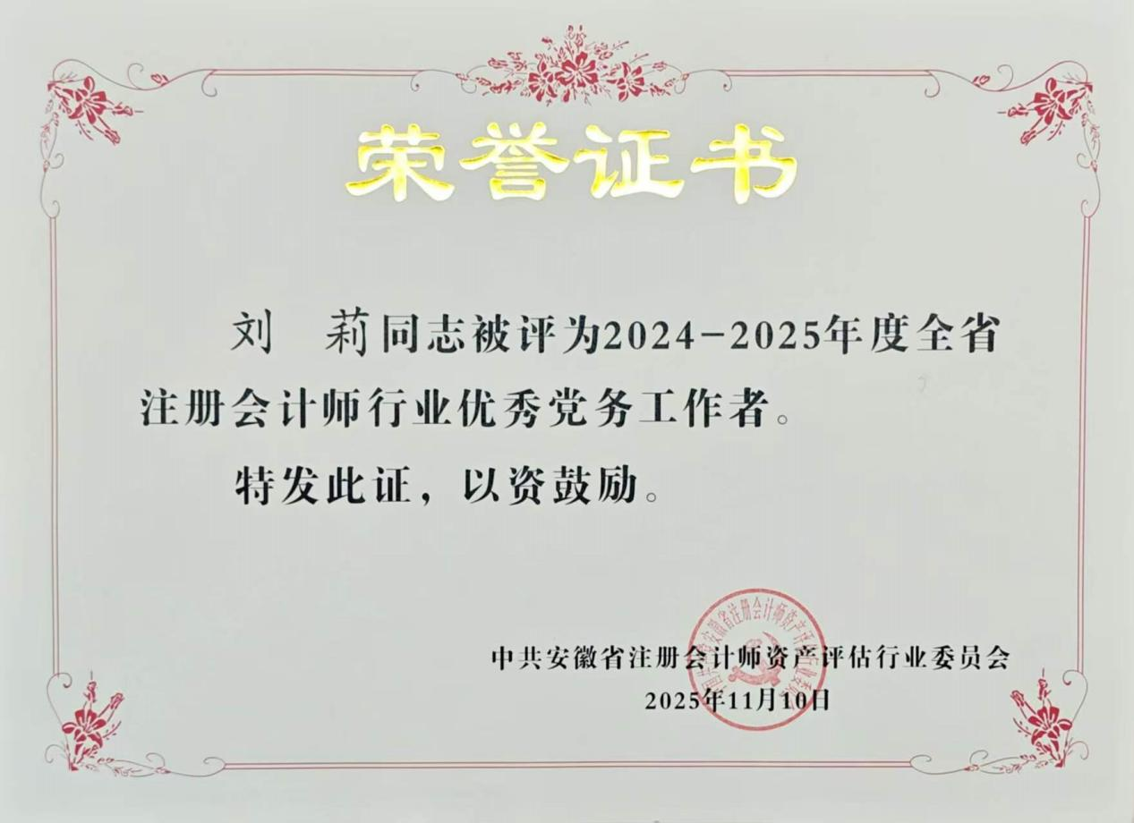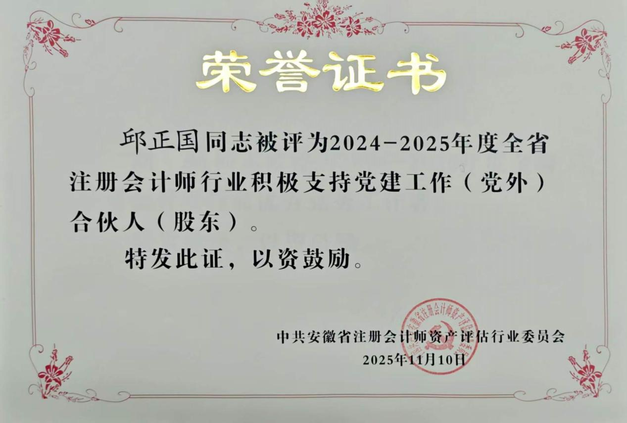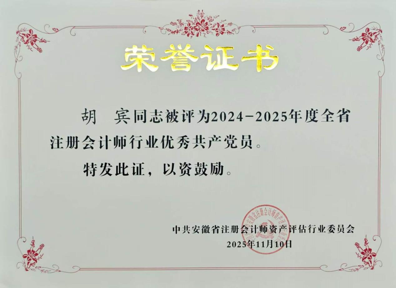 2025年10月31日,安徽省注册会计师行业党委组织开展的 2024-2025 年度全省注册会计师行业先进党组织和优秀个人评选表彰活动圆满落幕。凭借在党建工作中的扎实举措与突出成效,中共安徽新思辰会计师事务所支部荣获“先进基层党组织”称号;董事长胡宾同志获评“优秀共产党员”;邱正国同志荣获“积极支持党建工作(党外)合伙人”荣誉;刘莉同志被授予“优秀党务工作者”称号。